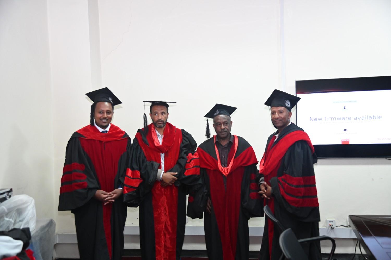 The defense session was chaired by Prof. Feleke Zewge from Addis Ababa University. Dr. Andualem Mekonnen of Addis Ababa University served as the internal examiner, while Prof. Zinabu Gebremariam from Hawassa University participated as the external examiner.